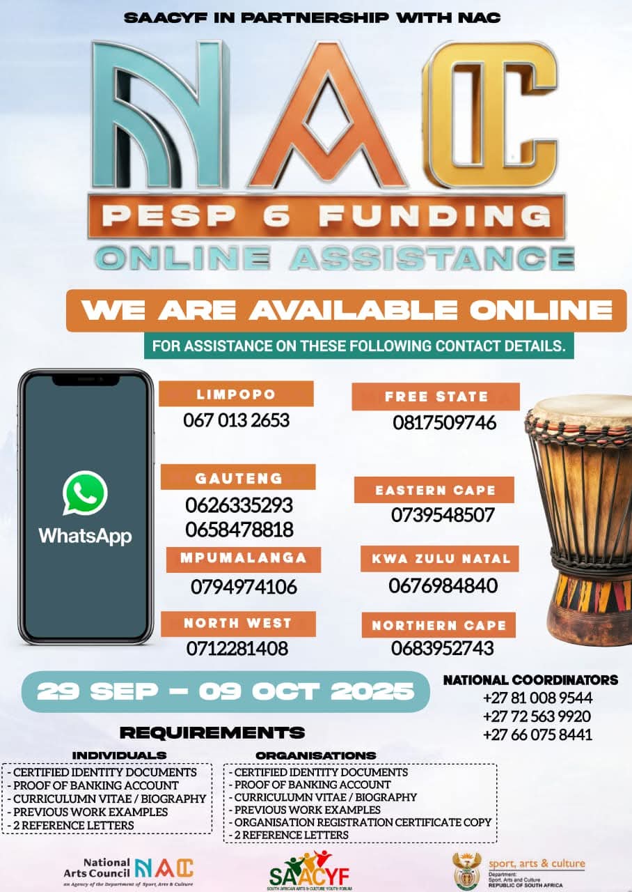 Recognising this challenge, the South African Arts & Culture Youth Forum (SAACYF), in partnership with the NAC, has launched the NAC PESP 6 Funding Help Desk initiative. This programme is designed to provide hands-on support to ensure that artists and organisations are equipped with the knowledge and compliance documents required to submit successful applications.